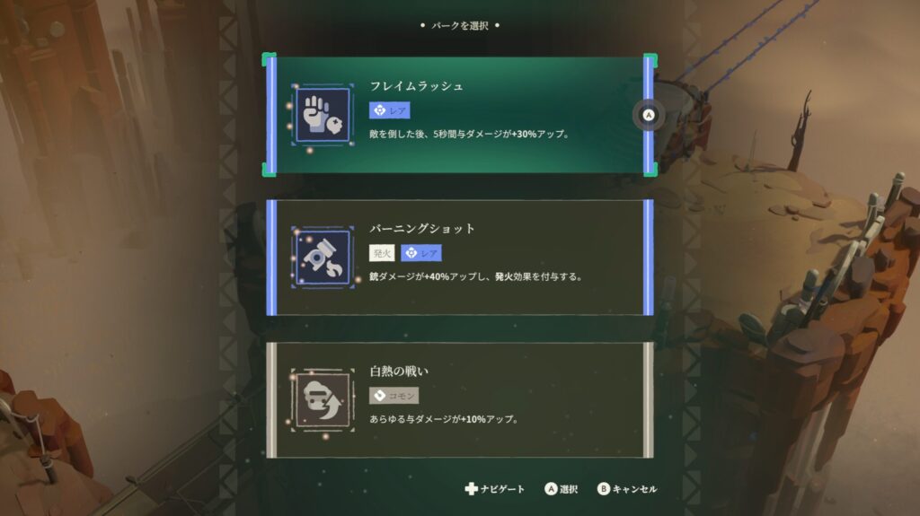 今作からの大きな追加要素として、ダンジョン探索中のみ有効な強化能力であるパークが追加されました。