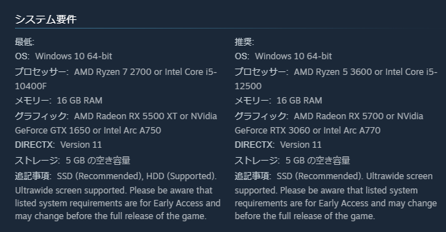 3D化による処理負荷や、早期アクセス特有の最適化不足も影響していると思われますが、低スペックPCや携帯型ゲーミングPCでのプレイを検討している方は、購入前に必ず自身の環境を確認することをおすすめします。